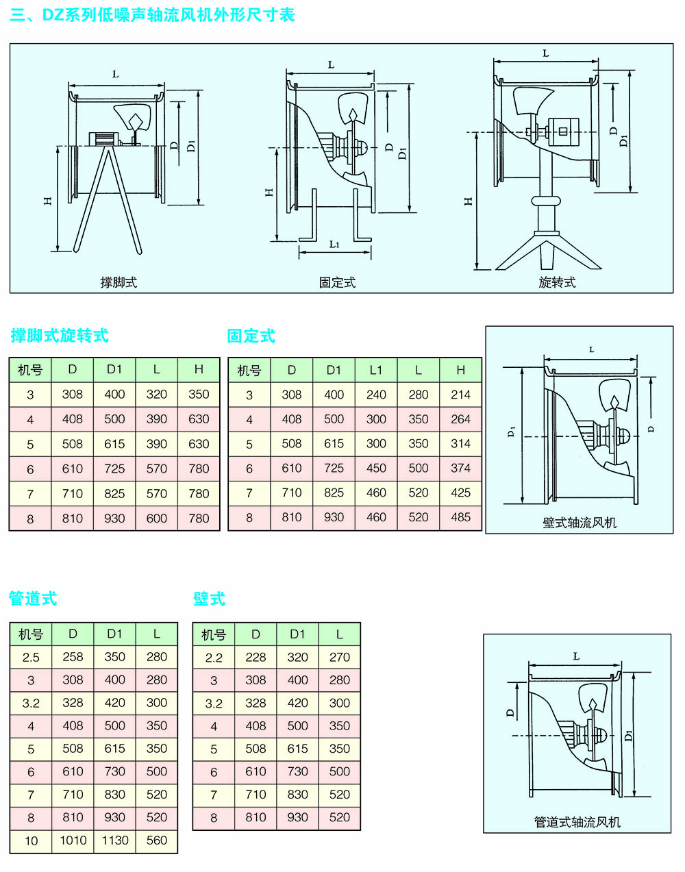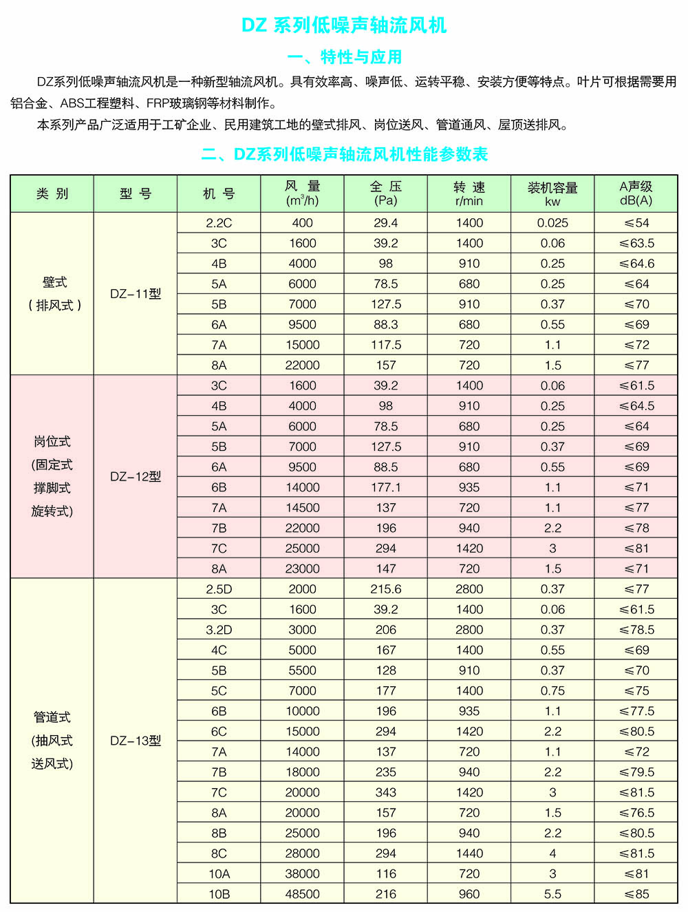 DZ系列低噪音轴流风机是一种新型轴流风机。具有效率高,噪音低,运转平稳,安装方便等特点,叶片可根据需要用铝合金、ABS工程塑料、FRP玻璃钢等材料制作。本系列产品广泛适用于工况企业、民用建筑的壁式排风、岗位送风、管道通风、屋顶送排风。