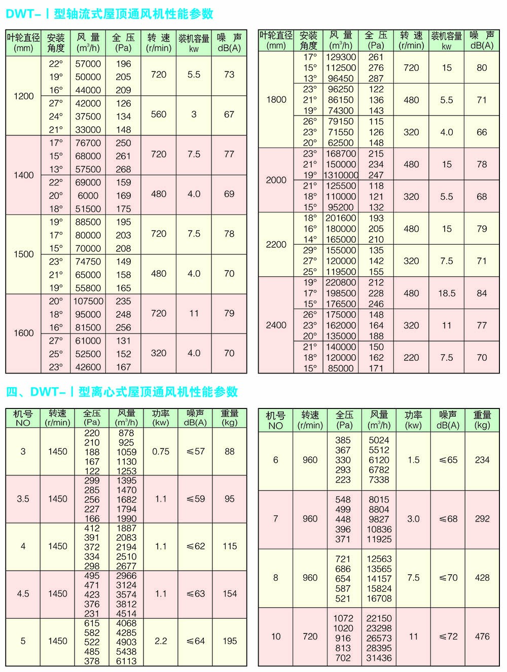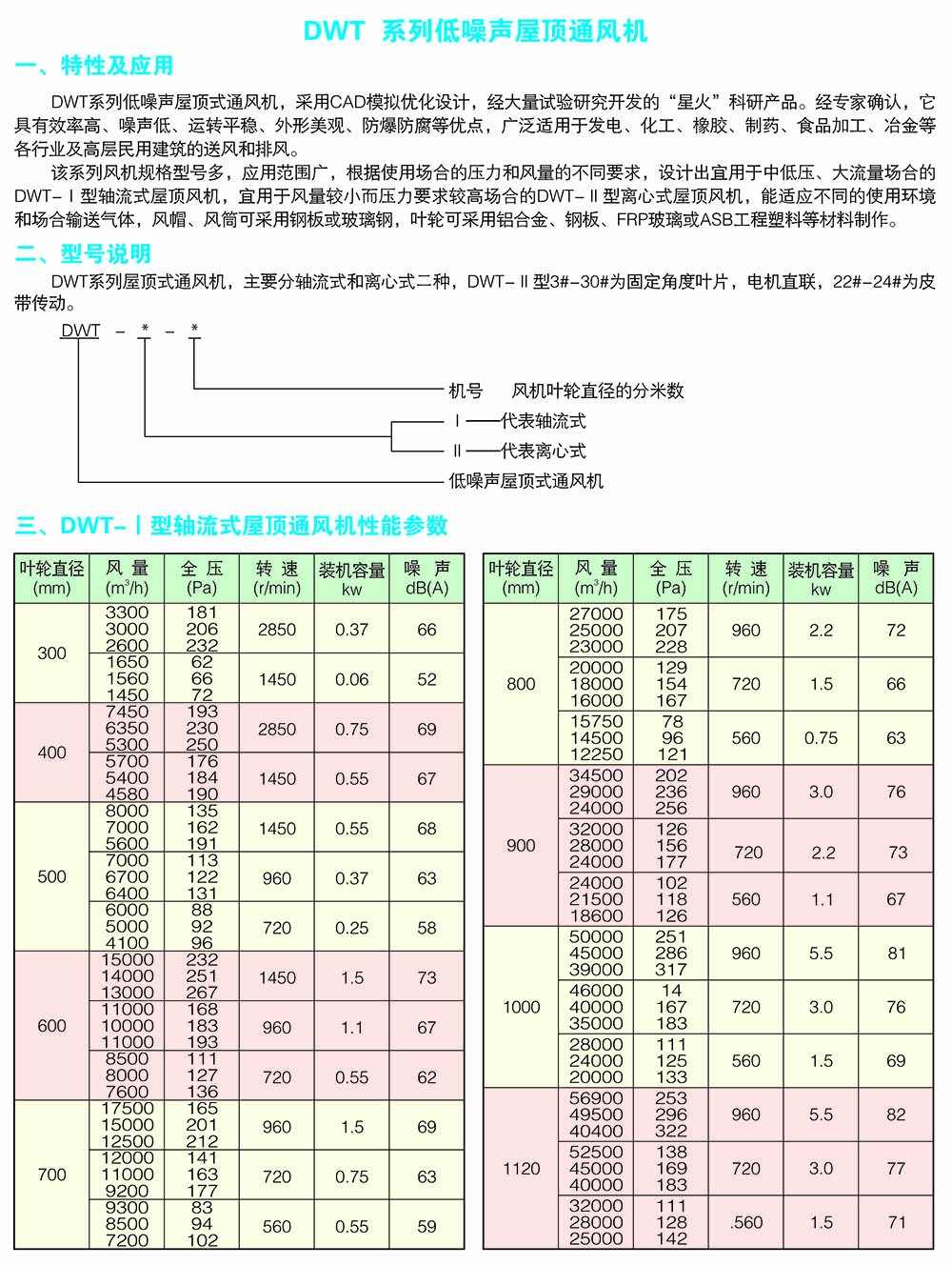 DWT系列轴流式屋顶风机分为二大类型,其一,轴流式屋顶风机:型号为DWT-II型、DWT-III型二种形式,宜适用于风量较小而压力要求较高的场合。