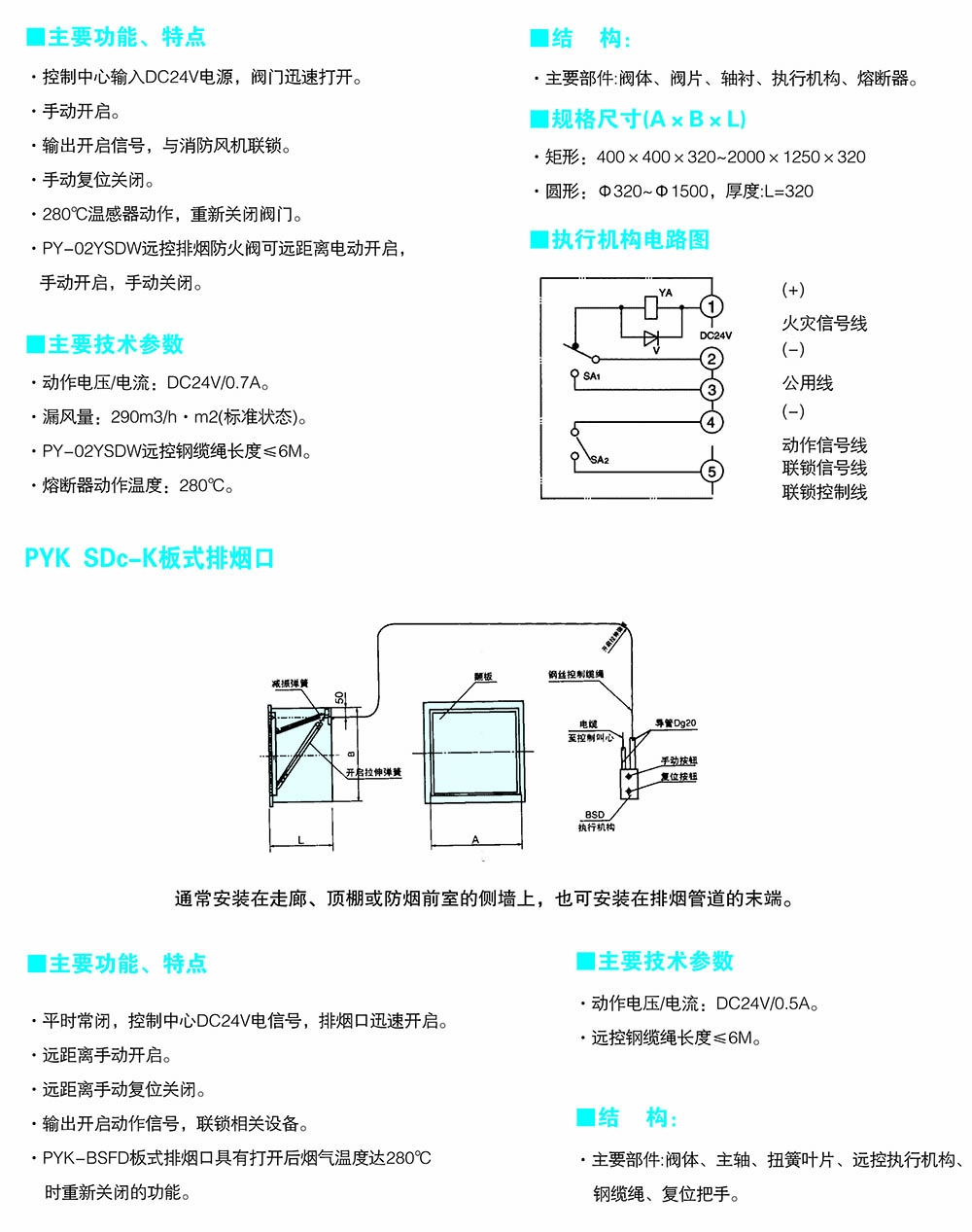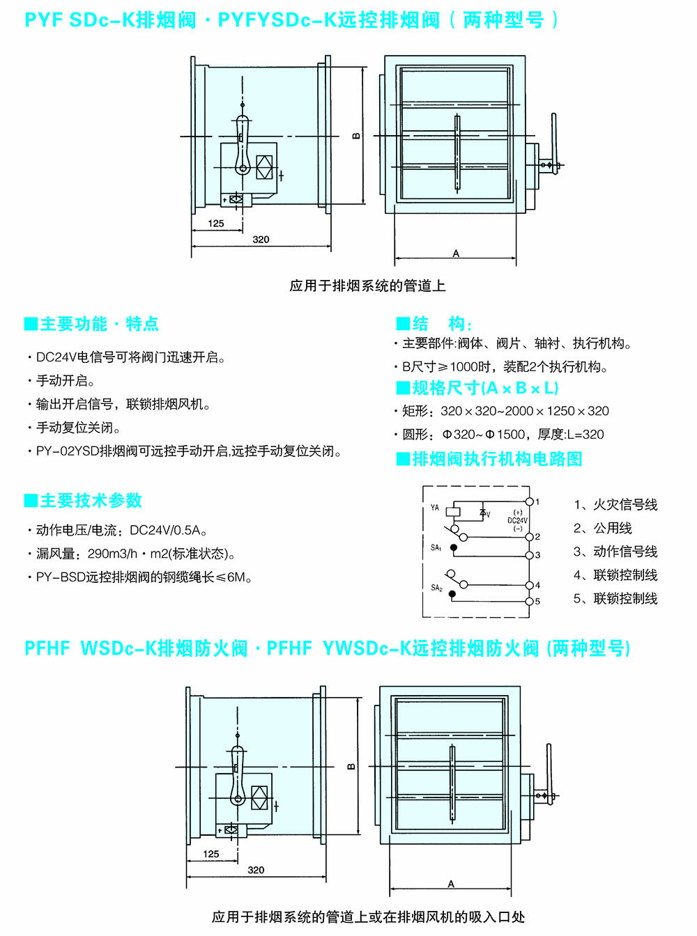 排烟防火阀PFHF-WSDc-K-WxH-I平时常开;Dc24V电动关闭,温感器280℃自动关闭,手动关闭,输出关闭信号;手动复位。